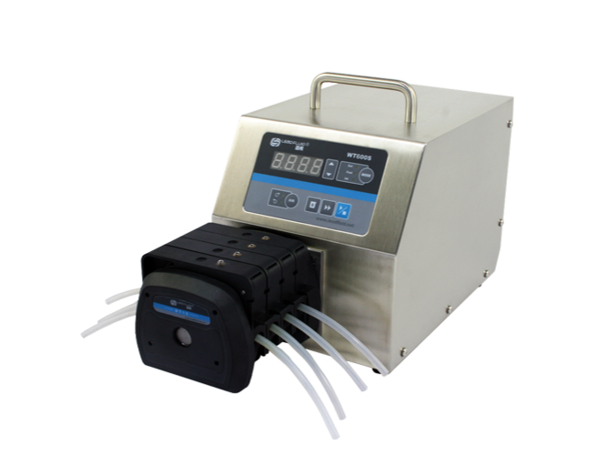 WT600S 大扭矩調速型蠕動泵浦採用直流無刷電機驅動,免維護,動力更強勁,可級聯多個泵頭。具有正反,啟停,全速 (清洗),調速等基本功能,可通過外部模擬量調整轉速,控制啟停和方向,而且增加了時間分裝功能。RS485通訊中採用MODBUS協定,更易於與其他控制設備如電腦,人機介面,PLC等連接。